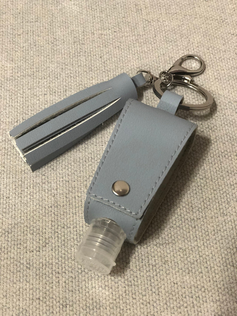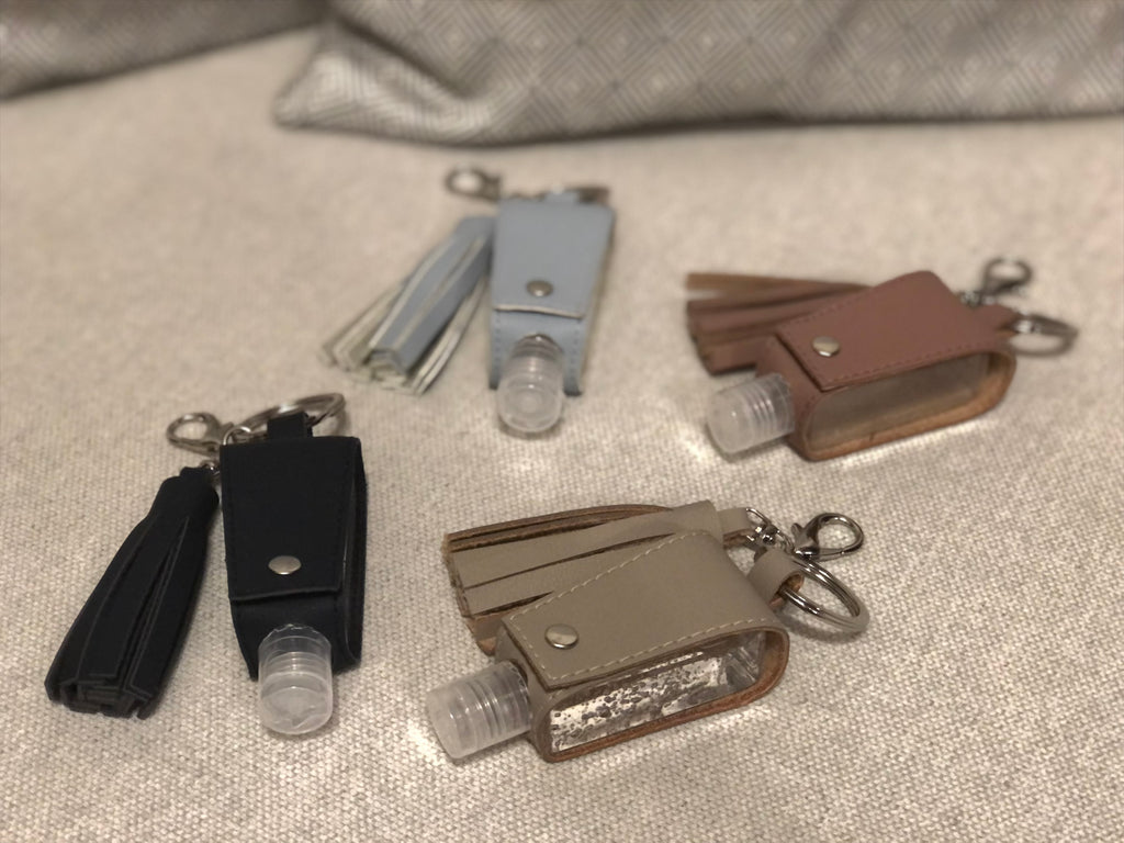 Edler Desinfektionsanhänger mit süsser Quaste aus hochwertigem Kunstleder, welcher mit dem Karabiner an jeder Tasche befestigt werden kann.
