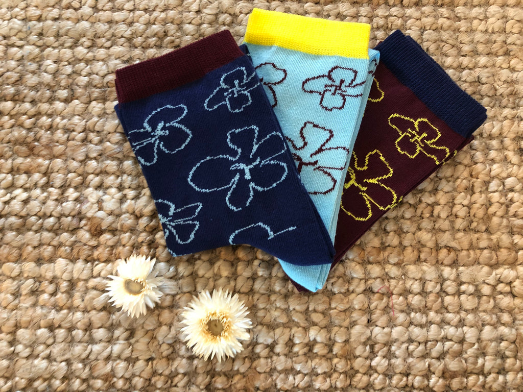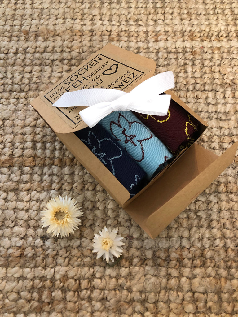 Die Sockenbox "Hortensien“ enthält 3 Paar Socken in dunkelblau, hellblau und bordeaux.
