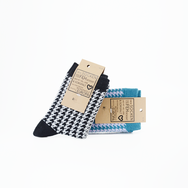 Das Säckchen enthält zwei Paar feh Socken im klassischen Hahnentritt Muster in den Modefarben schwarz/weiss und petrol/flieder.