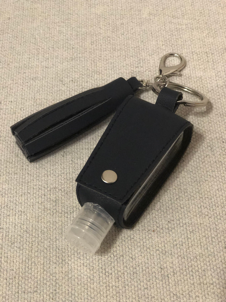 Edler Desinfektionsanhänger mit süsser Quaste aus hochwertigem Kunstleder, welcher mit dem Karabiner an jeder Tasche befestigt werden kann.