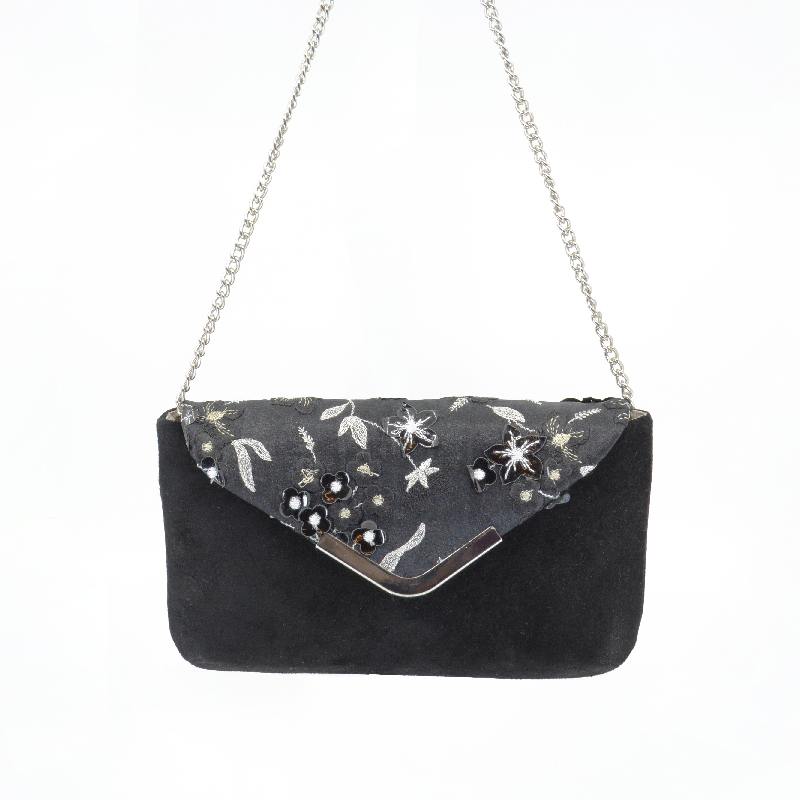 Edle Handtasche aus echtem Leder und hochwertiger St.Galler Stickerei von Jakob Schläpfer. Sie kann als Clutch oder Umhängetasche getragen werden.