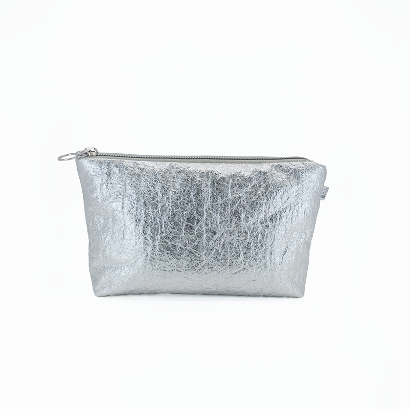Coole Kosmetiktasche aus hochwertigem und innovativem metallic Ananas-Leder, und einem schönen metallic Reissverschluss. Lässiges, schwarz weisses Karofutter aus beschichteter Baumwolle, ideal um feucht auszureiben.